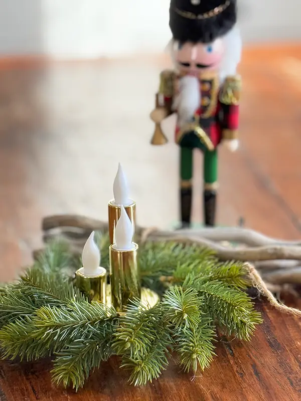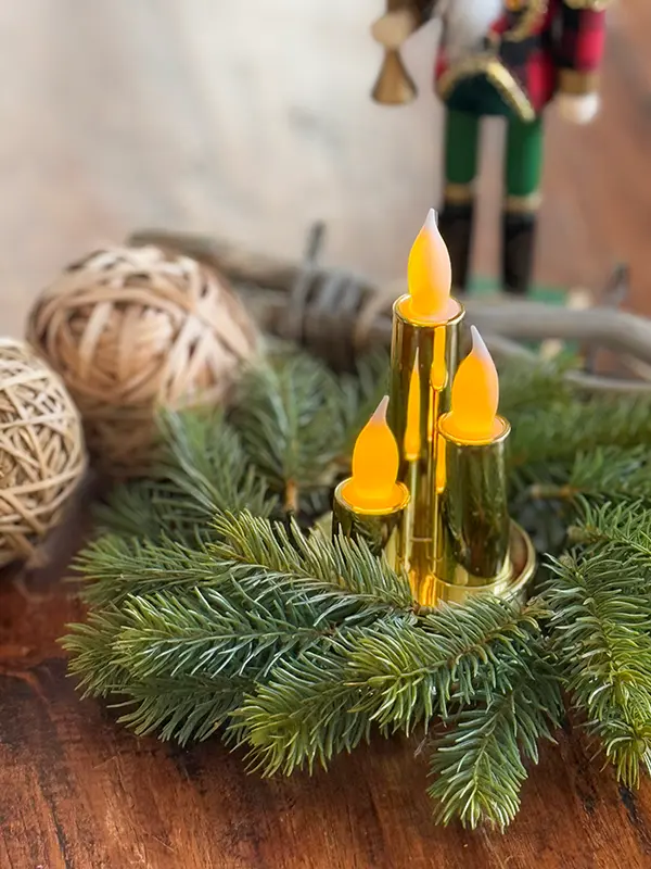 Dekoracja stroik świąteczny ze ZŁOTĄ świecą imitującą płomień
