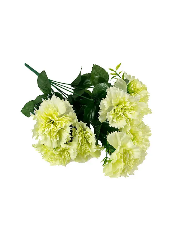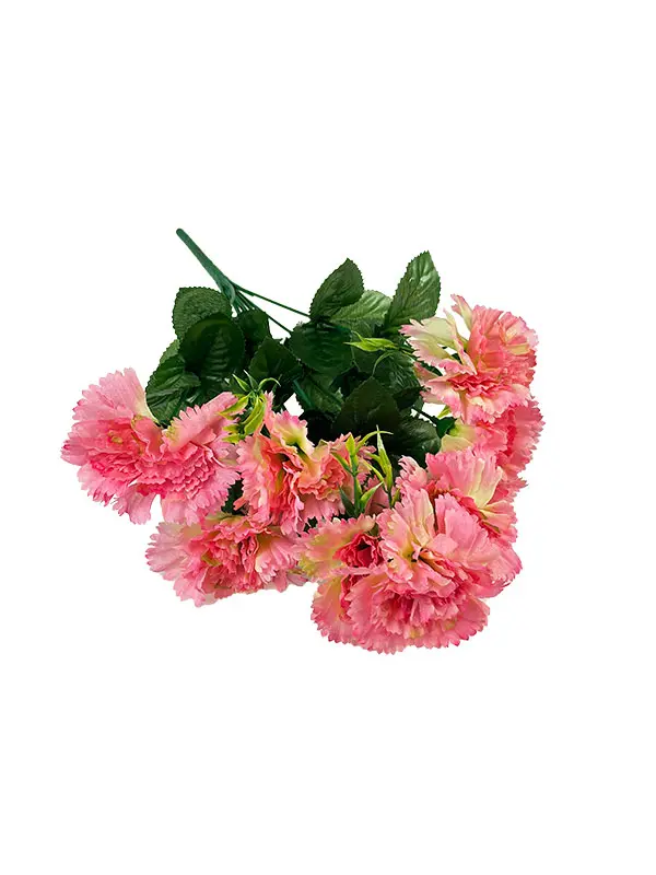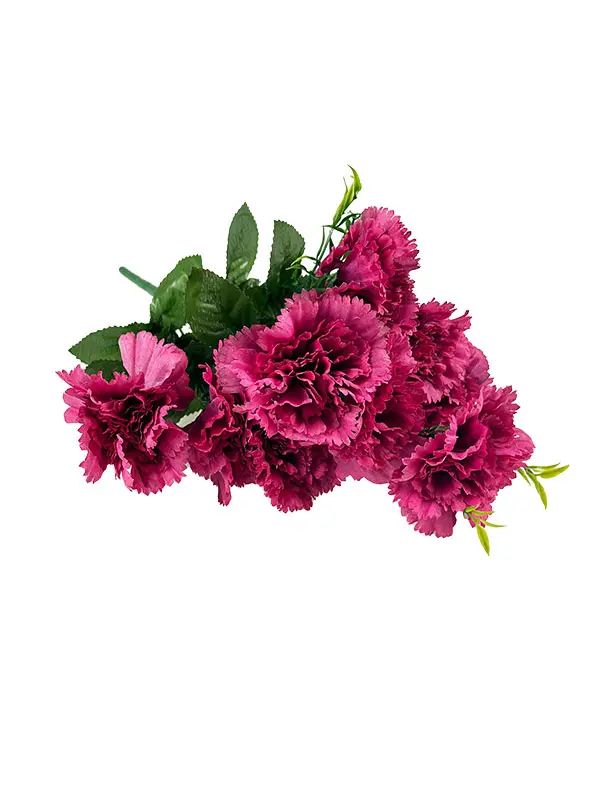 Sztuczny bukiet popularnych i lubianych kwiatów o nazwie goździk. Składa się z 9 kwiatów z liśćmi. Do wykorzystania jako gotowa ozdoba np. wazonu lub do dalszej obróbki.