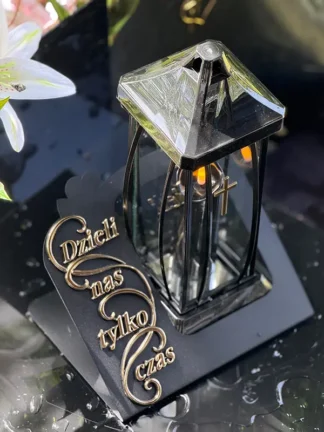 Znicz metalowy ze Świecą Gracja Czarna, Złoty napis „Dzieli Nas tylko czas” (39 cm)