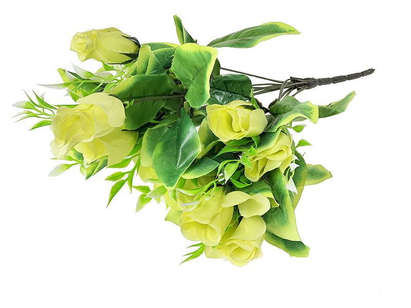 Bukiecik niewielkiej róży z jasno zielonym dodatkiem dostępny w rożnych kolorach. Do wykorzystania jako gotowa dekoracja wazonu lub do uzupełniania stroików, wieńców itp. Lekko błyszczący materiał i cieniowane płatki dodają bukietowi uroku.