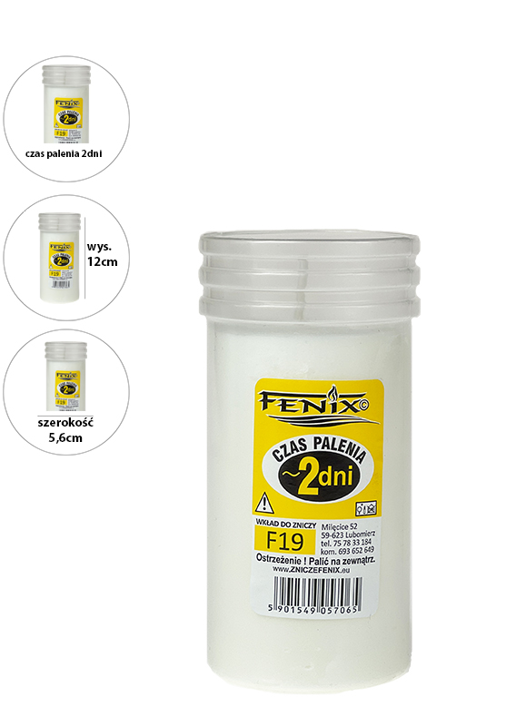 Wkład parafinowy zalewany F19 czas palenia ~2dni. Wysokość tuby 11,5 cm; średnica otworu tuby 5,7 cm. To produkt o doskonałej jakości, nie kopci i wypala się równomiernie do końca. Polecamy do małych lub średnich zniczy.*Czas palenia zależy od warunków pogodowych (np. temperatura, siła wiatru). Wkład do zniczy przeznaczony do użytku zewnętrznego w zniczach. Nie palić w pomieszczeniu!