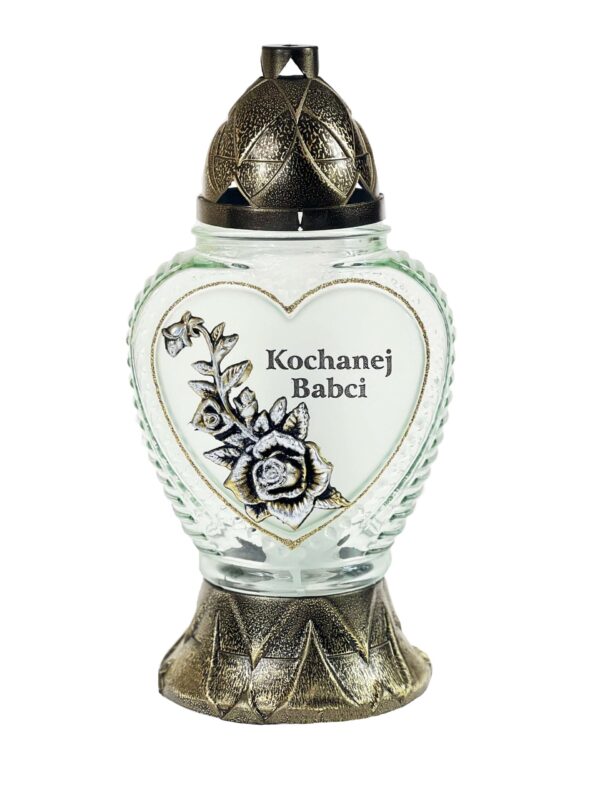 Znicz szklany, okolicznościowy upamiętniający zbliżający się Dzień Babci. Proste zdobienie w postaci aplikacji róży z wdzięcznym napisem Kochanej Babci…