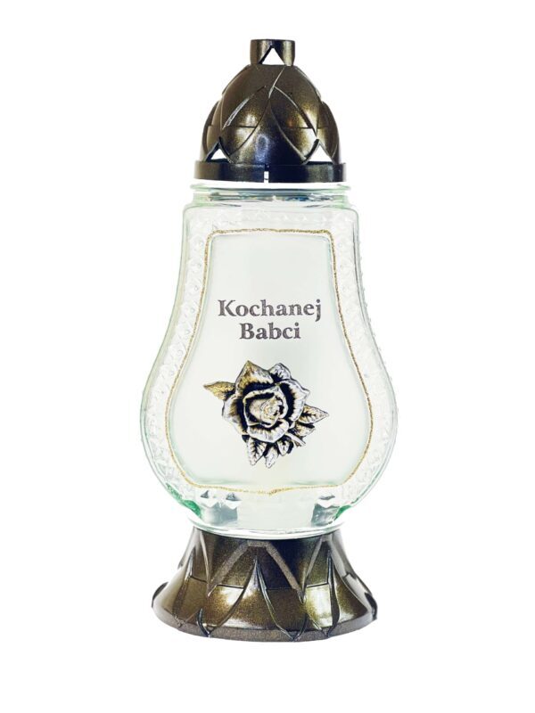 Znicz szklany, okolicznościowy upamiętniający zbliżający się Dzień Dziadka. Proste zdobienie w postaci aplikacji róży z eleganckim napisem Kochanej Babci…