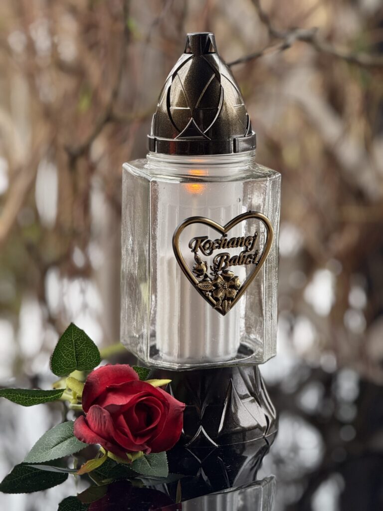 Znicz wykonany z przejrzystego szkła w eleganckim kształcie, który subtelnie podkreśla jego prostotę i elegancję. Na środku znajduje się złota aplikacja serca, a w jego wnętrzu widnieje delikatny napis „Kochanej Babci”. Całość prezentuje się niezwykle subtelnie i pełna jest ciepła oraz pamięci.