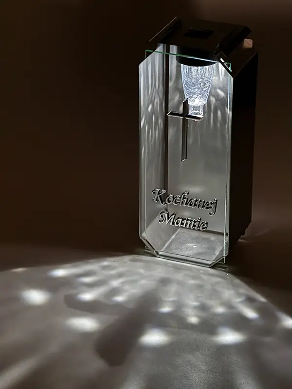 Elegancki design: Znicz składa się z metalowej obudowy oraz jednej szklanej ściany- przeźroczystej, która pięknie rozprasza światło.