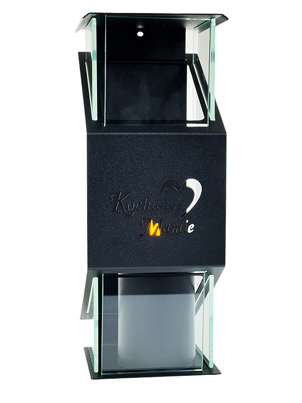- Elegancki design: Znicz składa się z metalowej obudowy oraz trzech szklanych transparentnych ścianek , które rozpraszają światło, tworząc spokojną i ciepłą atmosferę. Na przodzie znajduje się subtelny motyw serca z sentencją, dodający kapliczce wyjątkowego charakteru. Produkt zawiera czarną świecę