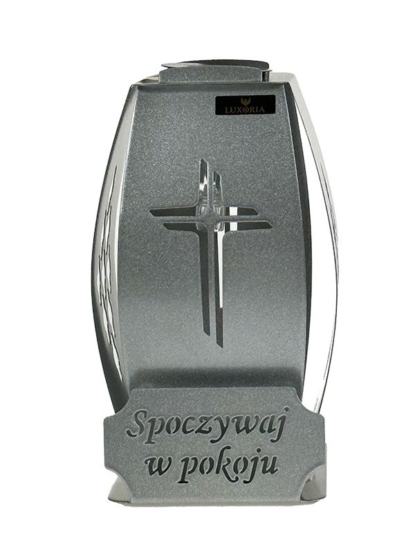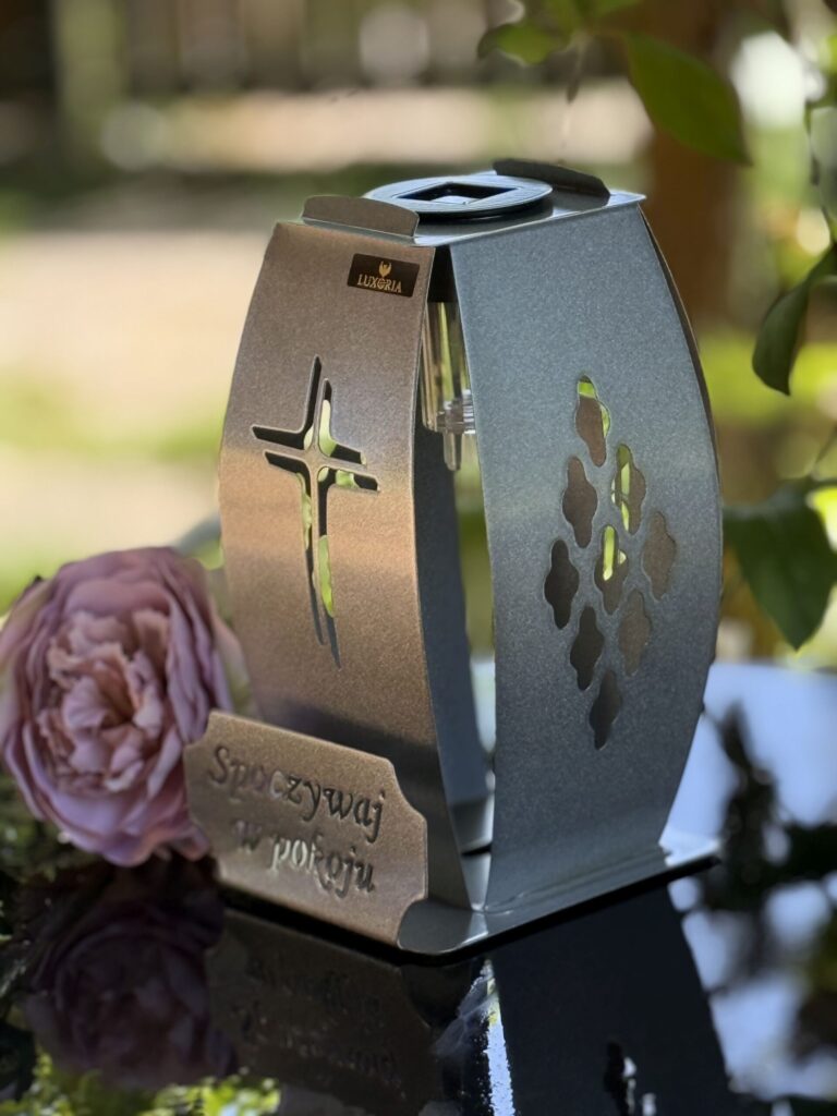 Kapliczka Solarna Metalowa LUXORIA 2 - Stal nierdzewna Krzyż Spoczywaj w Pokoju (22 cm)