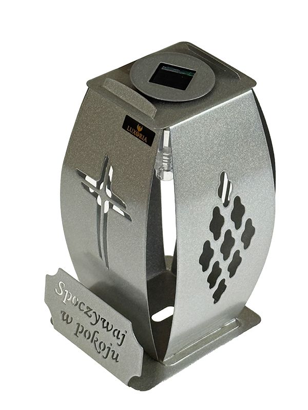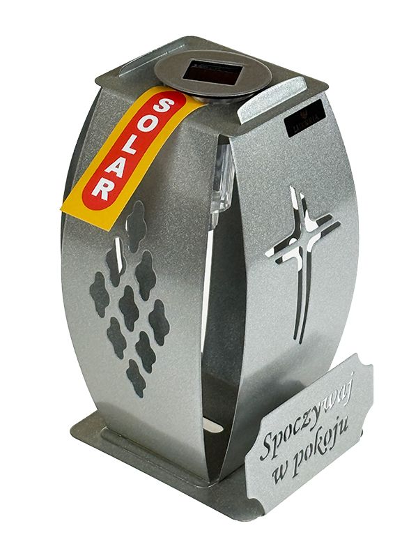 Solidna obudowa wykonana ze stali nierdzewnej malowana proszkowo jest odporna na korozję i warunki atmosferyczne, co gwarantuje wyjątkową trwałość. Wysokość kapliczki wynosi 22 cm, co sprawia, że produkt prezentuje się elegancko zarówno na cmentarzach, jak i w miejscach pamięci.