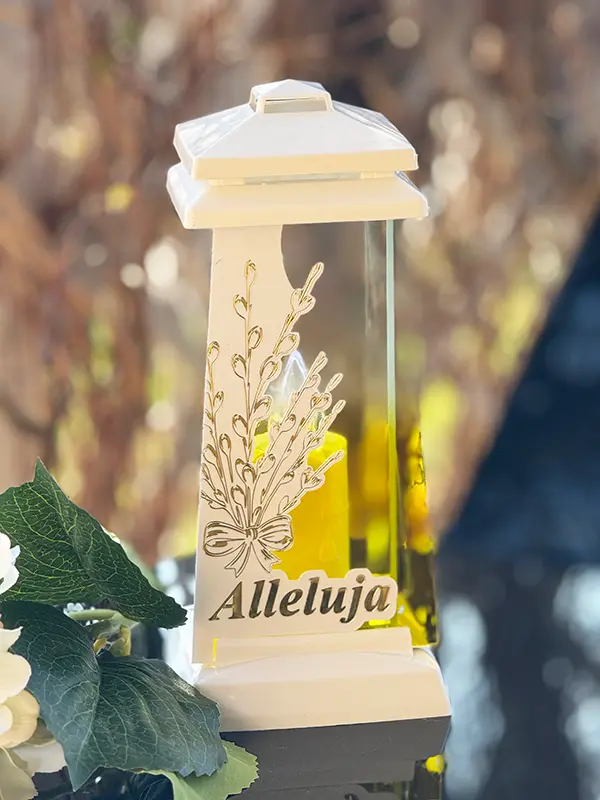 Znicz – lampion (podstawa oraz figurka) wykonany jest w 100% z ceramiki i przedstawia postać anioła siedzącego na podstawie.