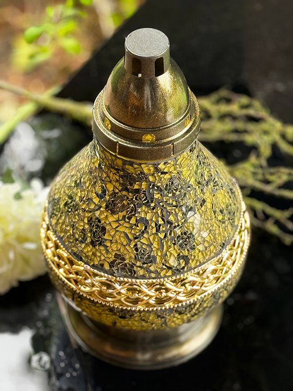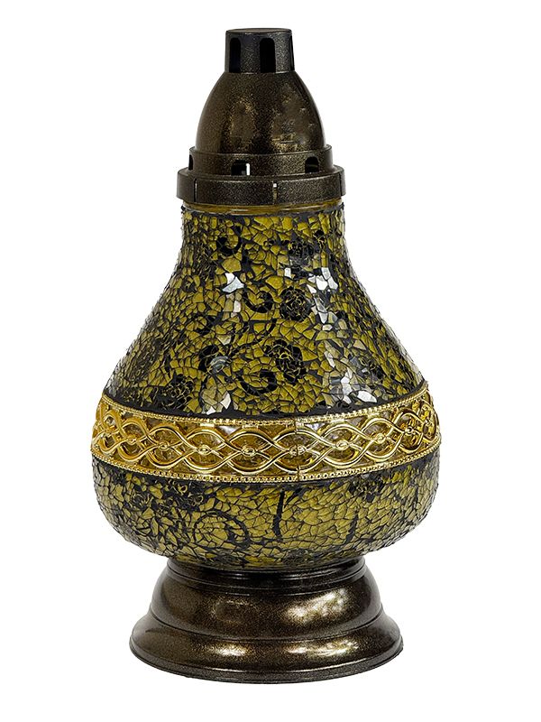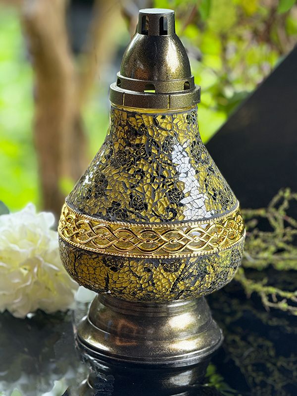 Znicz nagrobny o klasycznym kształcie Karafki, wykonany z trwałego materiału (szkło mozaikowe) w eleganckim, czarno- złotym kolorze z subtelnymi różami. Delikatne zdobienia i staranne wykończenie sprawiają, że stanowi gustowny element dekoracyjny, podkreślający szacunek i pamięć o bliskich.