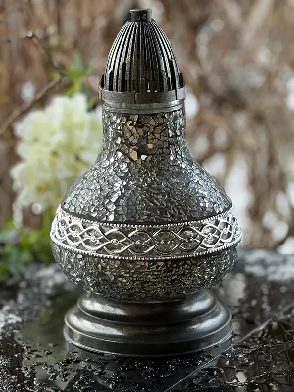 Znicz nagrobny o klasycznym kształcie, wykonany z trwałego materiału (szkło mozaikowe) w eleganckim, grafitowym kolorze. Subtelne zdobienia i staranne wykończenie sprawiają, że stanowi gustowny element dekoracyjny, podkreślający szacunek i pamięć o bliskich.