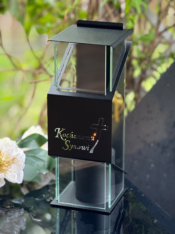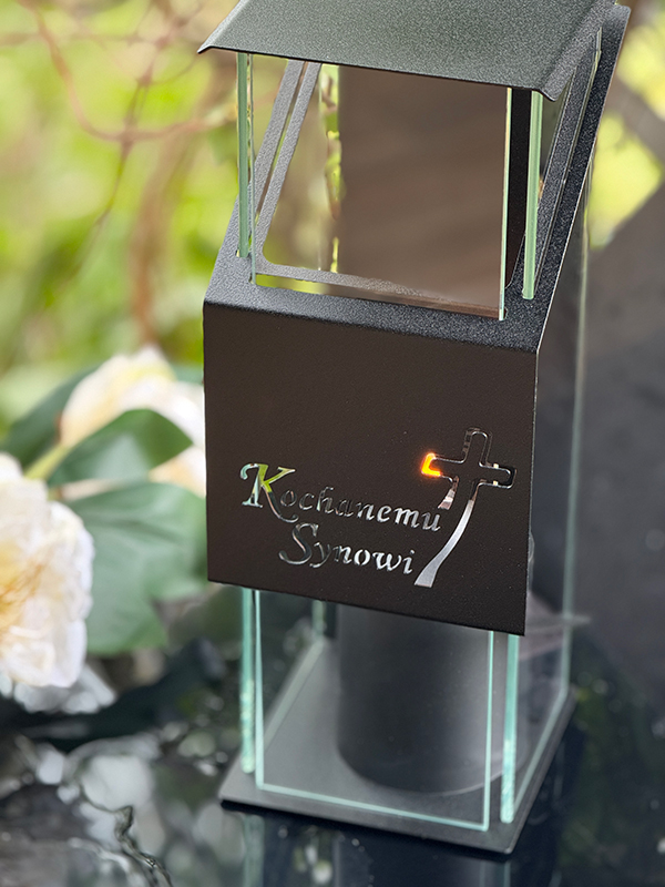 Kapliczka składa się z metalowej obudowy oraz trzech ścianek ze szkła w kolorze czarnym, które nadają jej elegancki, elegancki wygląd. Na przodzie znajduje się subtelny motyw krzyża i sentencja co dodaje zniczowi symbolicznego charakteru i czyni go idealnym wyborem na miejsca pamięci. Znicz ma wysokość 32,5 cm i szerokość 12 cm, co sprawia, że jest odpowiednio wyeksponowany, nie zajmując przy tym zbyt dużo miejsca.