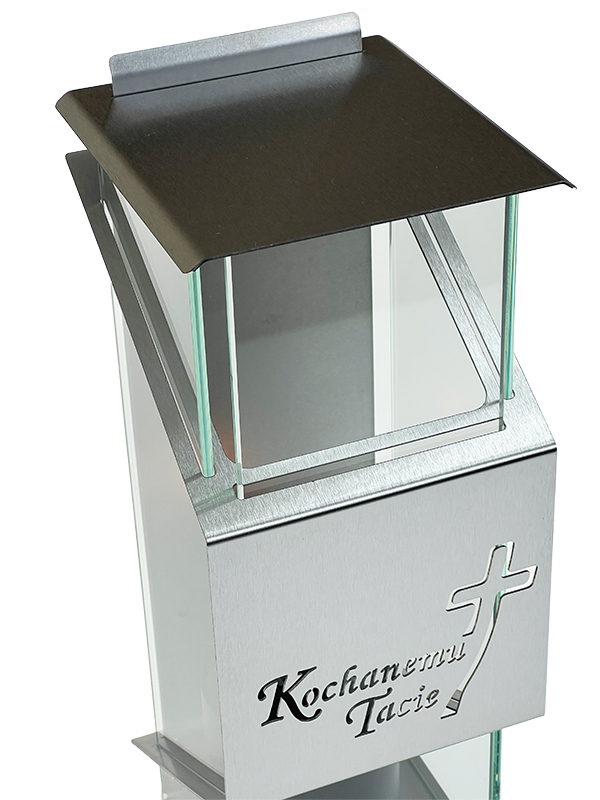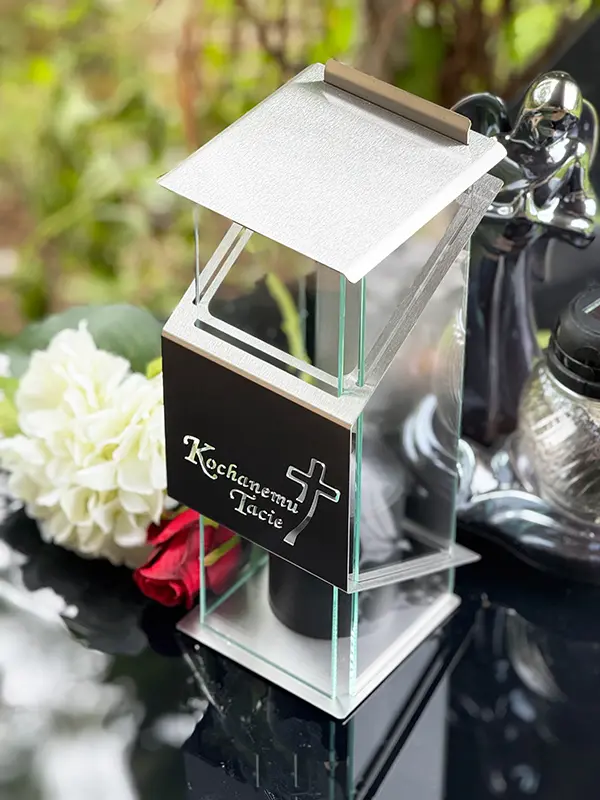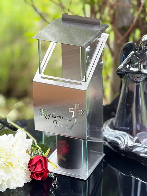 Kapliczka składa się z metalowej obudowy oraz trzech ścianek ze szkła w kolorze srebrnym, które nadają jej elegancki, elegancki wygląd. Na przodzie znajduje się subtelny motyw krzyża i sentencja co dodaje zniczowi symbolicznego charakteru i czyni go idealnym wyborem na miejsca pamięci. Znicz ma wysokość 32,5 cm i szerokość 12 cm, co sprawia, że jest odpowiednio wyeksponowany, nie zajmując przy tym zbyt dużo miejsca.