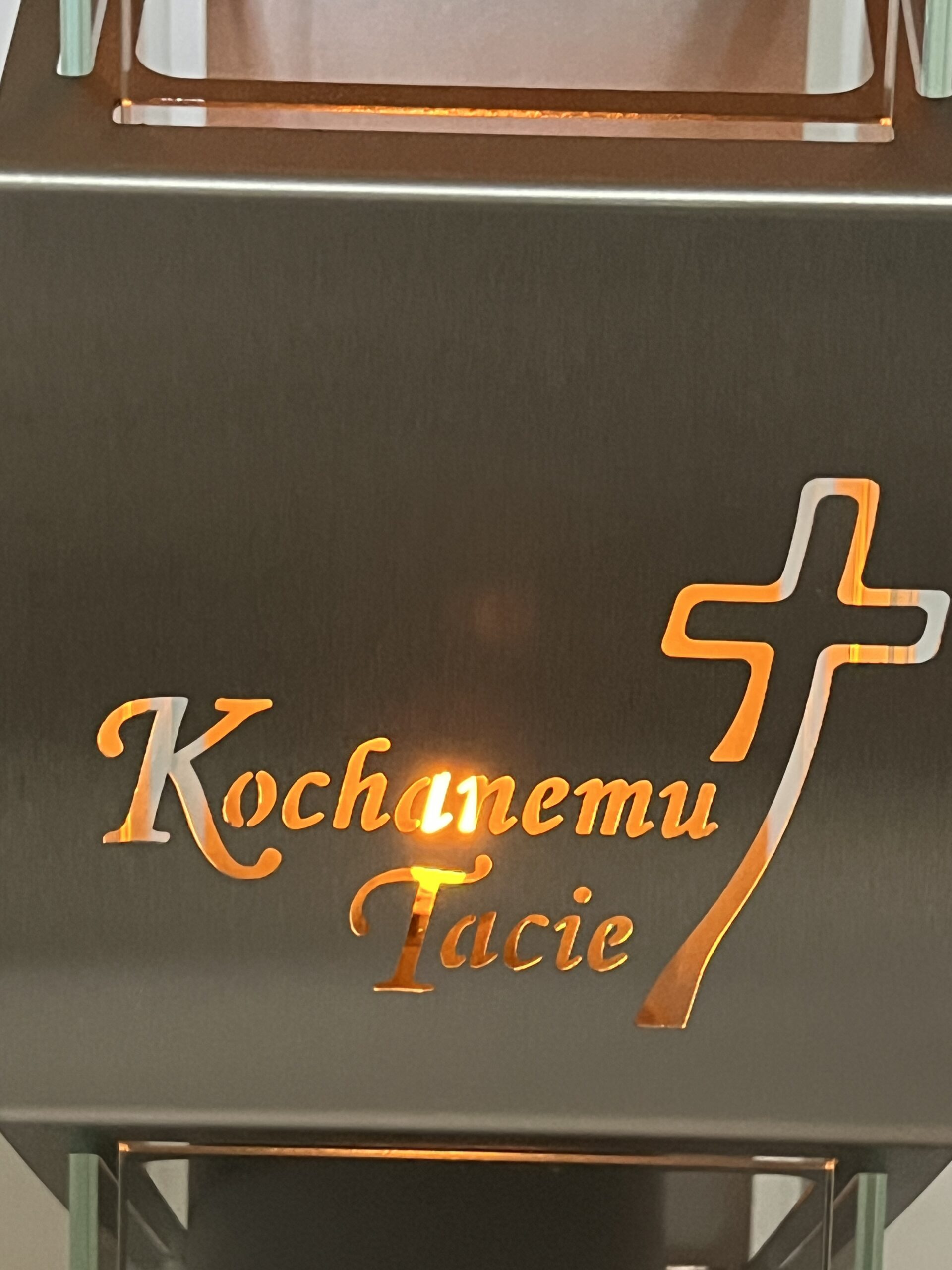 - Elegancki design: Znicz składa się z metalowej obudowy oraz trzech szklanych transparentnych ścianek , które rozpraszają światło, tworząc spokojną i ciepłą atmosferę. Na przodzie znajduje się subtelny motyw krzyża z sentencją, dodający kapliczce wyjątkowego charakteru. Produkt zawiera czarną świecę