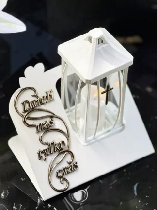 Znicz metalowy ze Świecą Gracja Biała, Złoty napis „Dzieli Nas tylko czas” (30cm)