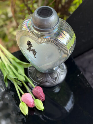 Znicz solarny ZSE9 Róża Srebrny Tęczowe szkło (31,5 cm)